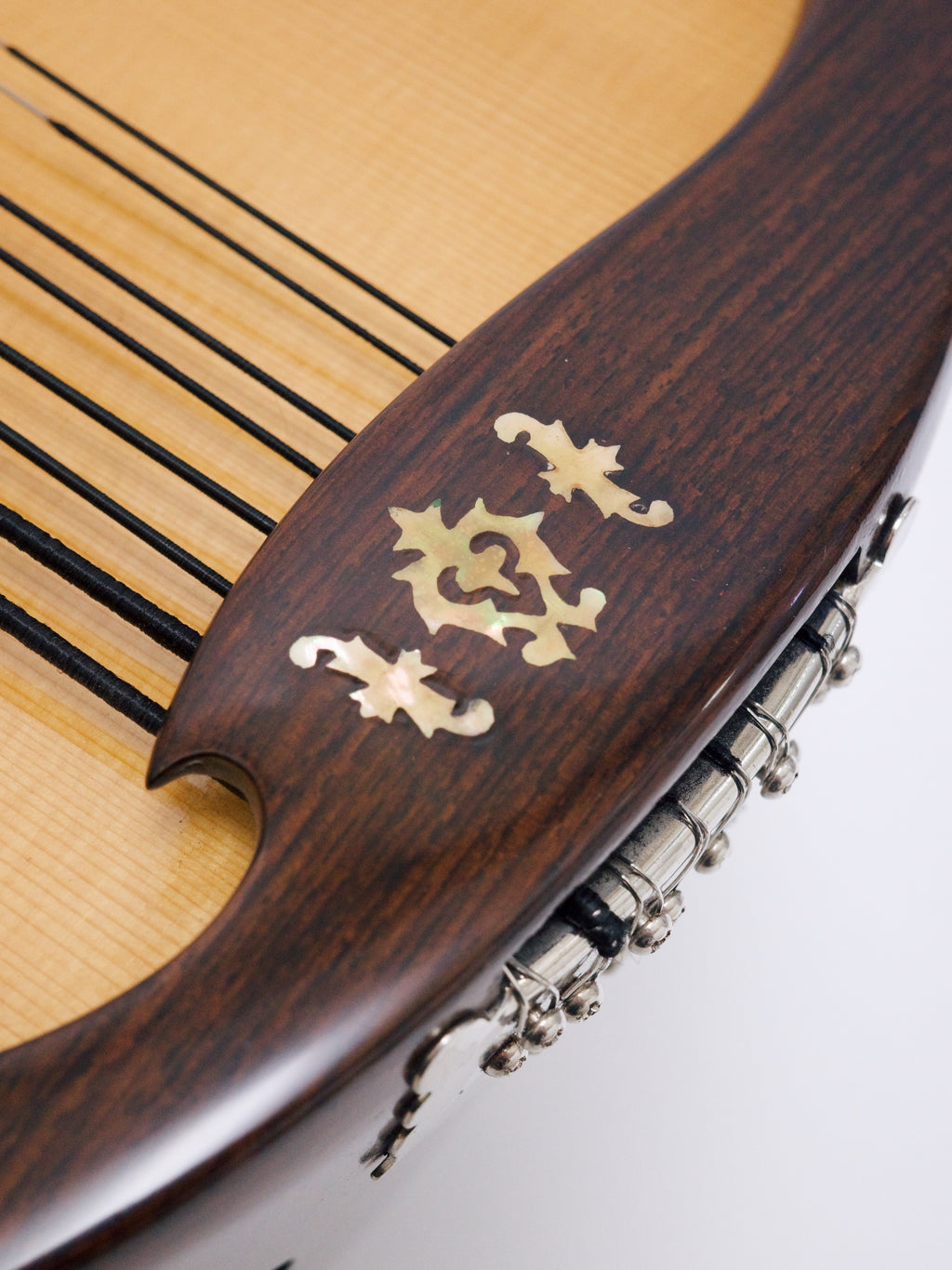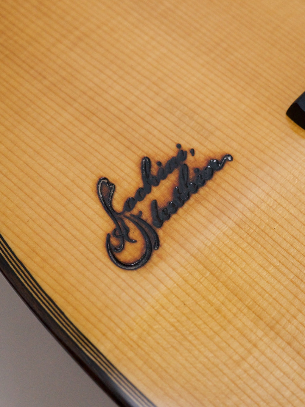 「DS-2」を元にローズウッドボディを採用し、表板には落合工房の焼き印、アームガードにはオリジナルの貝装飾が入っています。