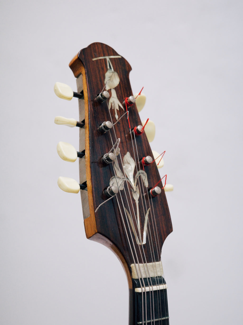 ピックガード、ヘッドへのインレイはカラーチェを象徴するデザインとなっております。